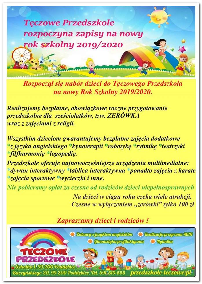 Tęczowe Przedszkole i Żłobek rozpoczynają nabór dzieci na nowy rok szkolny 2020/2021.